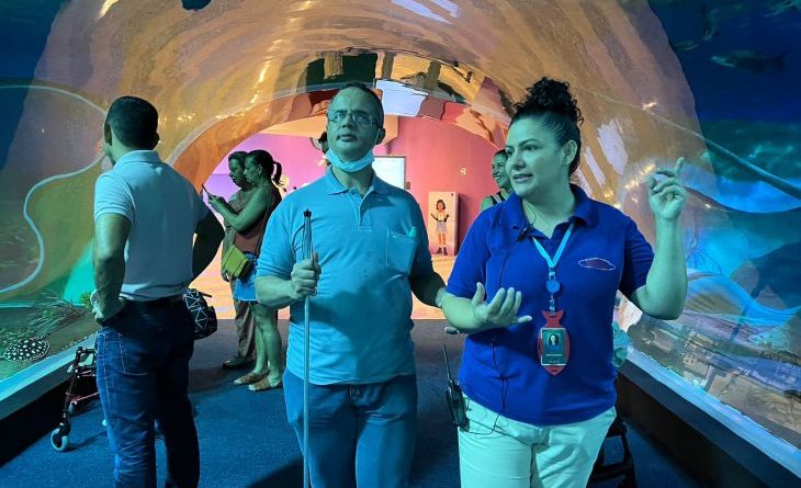 Deficientes visuais podem conhecer o “Espaço Biotátil”, espaço exclusivo para experiência tátil, além de guia de visitação, material didático e identificação dos tanques em braile.