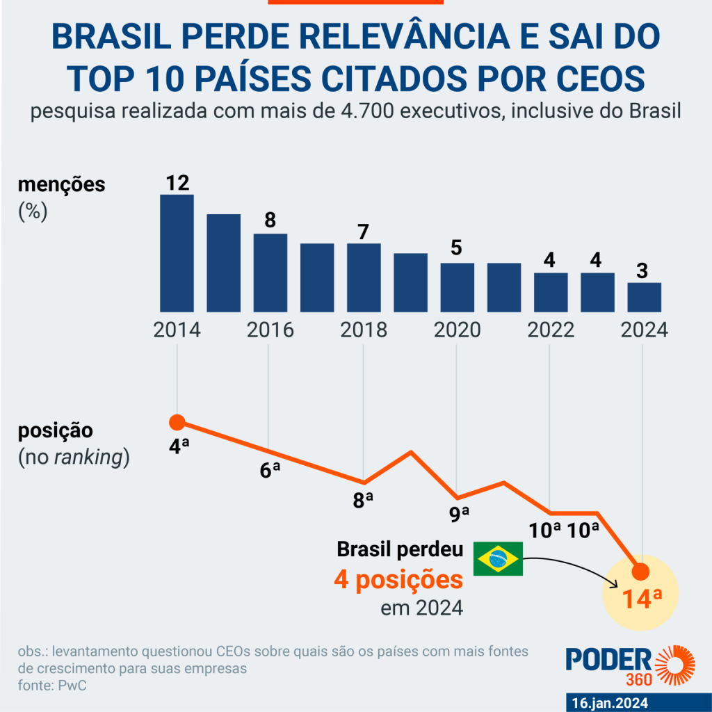 A participação esvaziada e com pouca atenção do Brasil parecem indicar para resultados contrários. A consultora PwC publicou um relatório em Davos que mostra um aumento no desinteresse dos empresários. Pela 1ª vez, o país não ocupa o top 10 de territórios mais atrativos para CEOs de grandes companhias.