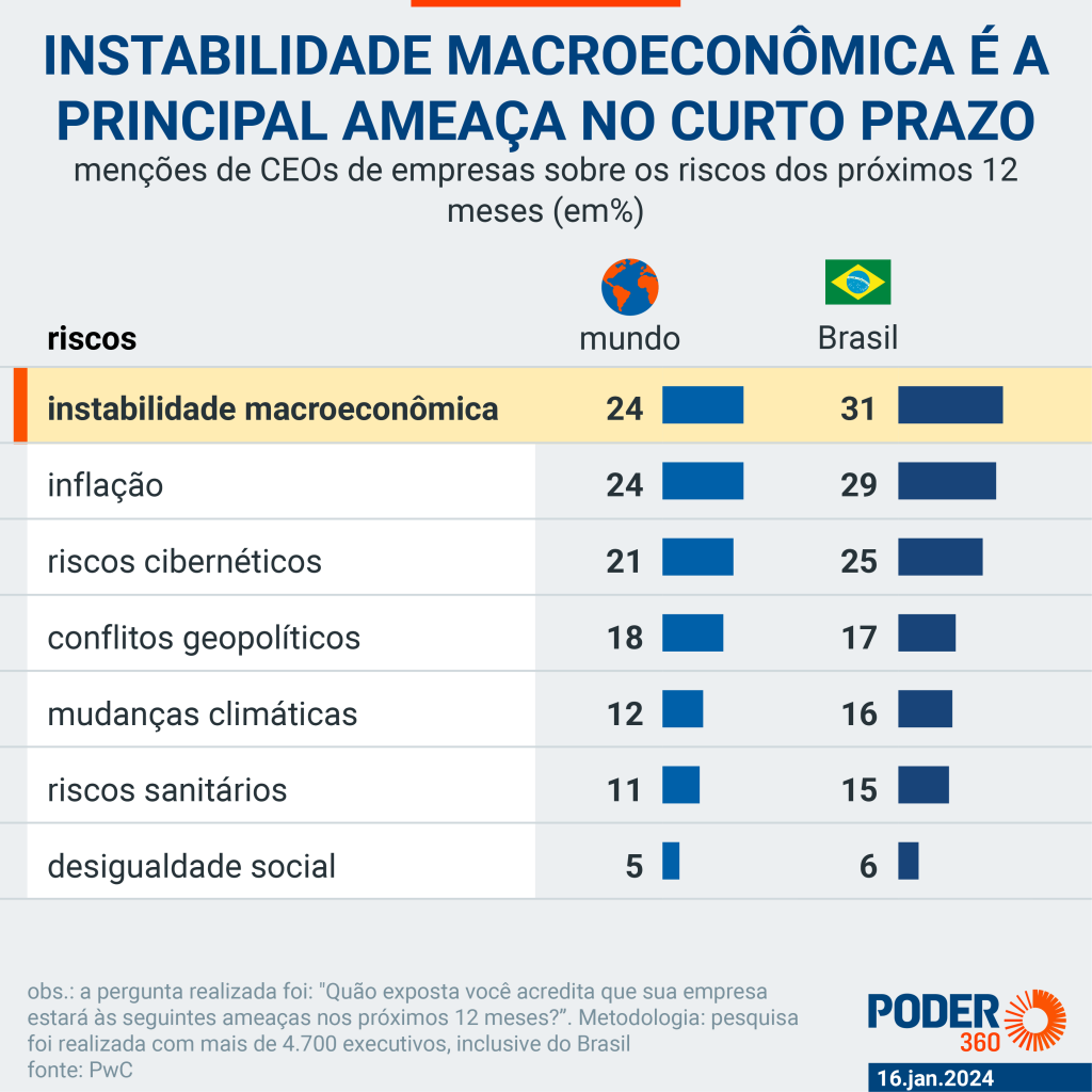 As principais ameaças são a inflação e a instabilidade macroeconômica, segundo os executivos mundiais.