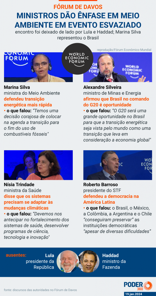 A 54ª edição do Fórum Econômico Mundial terminou na 6ª feira (19.jan.2024) com uma participação esvaziada do Brasil. As poucas autoridades que foram a Davos (Suíça) evitaram falar sobre assuntos diretamente ligados à macroeconomia e decidiram dar ênfase a pautas de sustentabilidade.