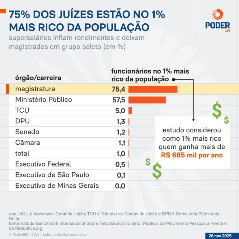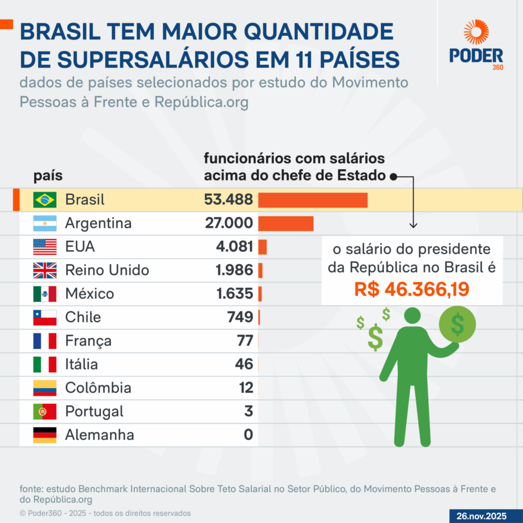 Estudo do Movimento Pessoas à Frente e da República.org divulgado nesta 4ª feira (26.nov.2025) mostra o Brasil no topo do ranking de supersalários na comparação com outros 10 países com características sociais e culturais semelhantes.