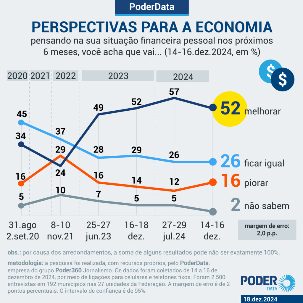 Pesquisa PoderData mostra que os brasileiros estão menos otimistas em relação à sua situação financeira pessoal que há 6 meses. Hoje, 52% dos eleitores dizem acreditar que suas finanças vão “melhorar” no próximo semestre. A taxa recuou 5 pontos percentuais desde julho, quando era de 57% –a maior desde a pandemia.