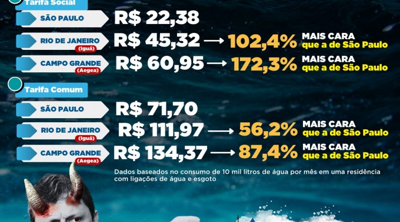 A tarifa residencial para 10 mil litros de água por mês custa R$ 134,37 em Campo Grande, onde está incluído a tarifa fixa de R$ 17. O valor é 87,4% mais caro do que o valor pago pelos paulistas, onde a mesma quantia sai por R$ 71.70. No Rio, o valor é de R$ 111,97. A privatização da Sabesp é a principal prioridade do governador bolsonarista. O projeto foi encaminhado à Assembleia Legislativa para ser votado em regime de urgência.