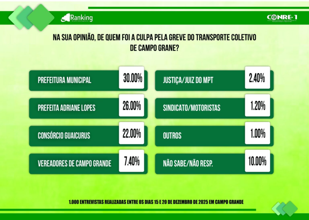 A última pesquisa do Instituto Ranking Brasil Inteligência coincidiu com a 2ª greve mais longa da história do transporte coletivo em Campo Grande. Entre os entrevistados, 56% disseram que a culpa da paralisação é da gestão da prefeita Adriane Lopes (PP), sendo que 26% consideram que a chefe do Paço Municipal é a responsável direta pelos ônibus terem ficado quatro dias sem ir às ruas.