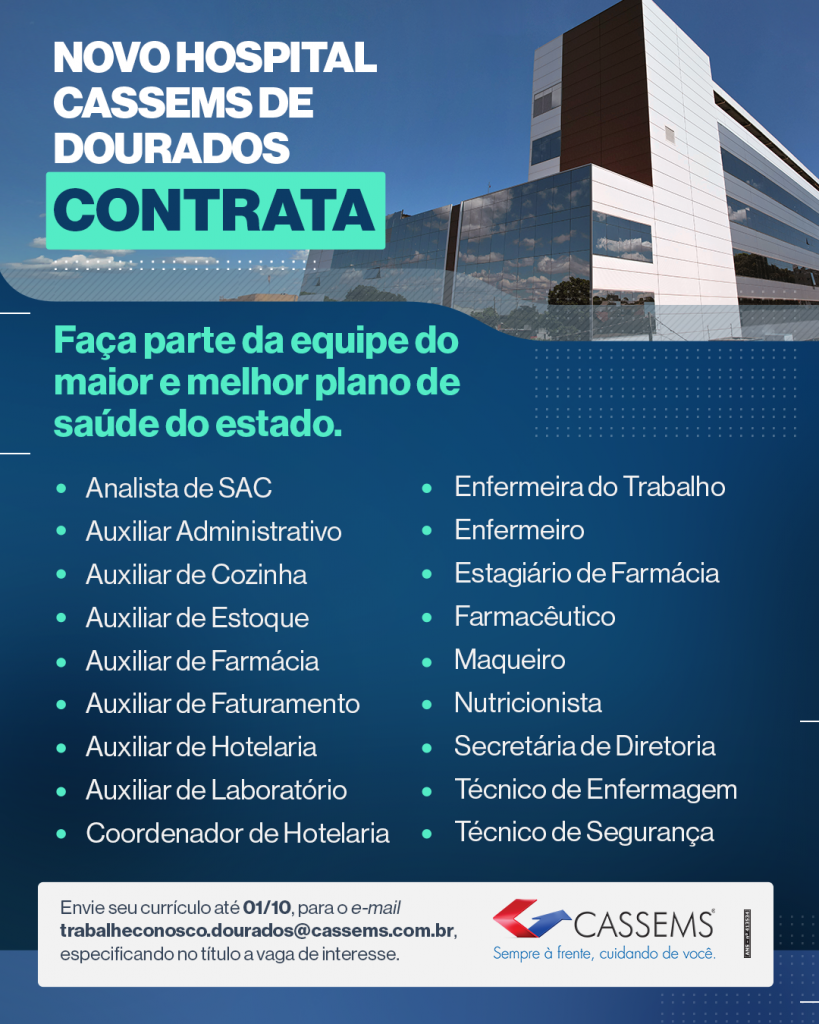 Os interessados devem enviar currículo para o e-mail: tabalheconosco.dourados@cassems.com.br, com o título “Vaga Dourados”.