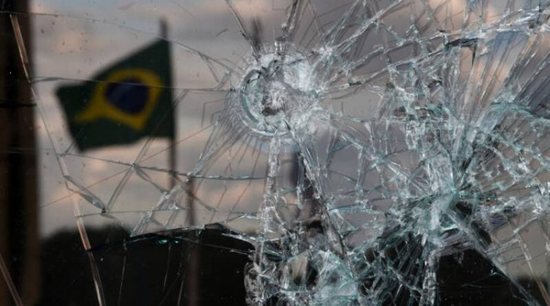 Ler maisBandeira brasileira se reflete em uma janela quebrada do prédio do STF em Brasília, dois dias após os ataques de