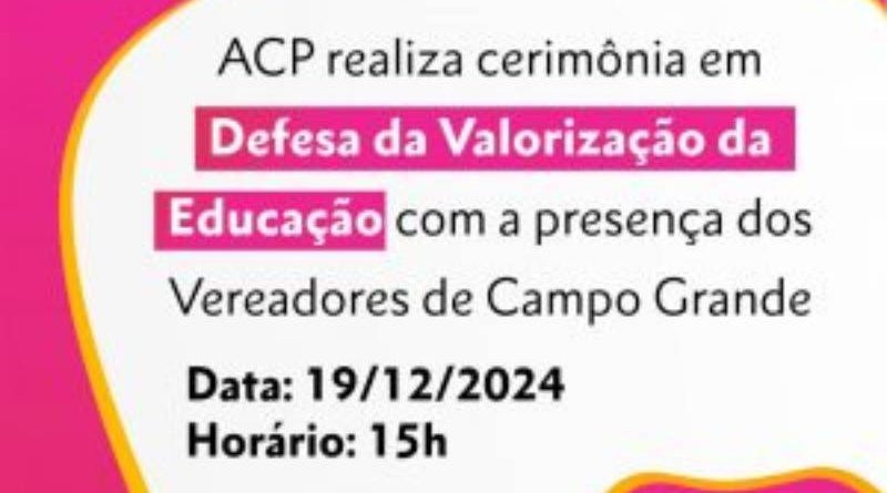 O Sindicato Campo-grandense dos Profissionais da Educação Pública (ACP), realizará no dia 19 de dezembro (quinta-feira), às 15h, a cerimônia “Frente em Defesa da Valorização da Educação Pública em Campo Grande”, que tem por objetivo a renovação do compromisso, diálogo e a defesa da Educação Pública com os vereadores de Campo Grande.