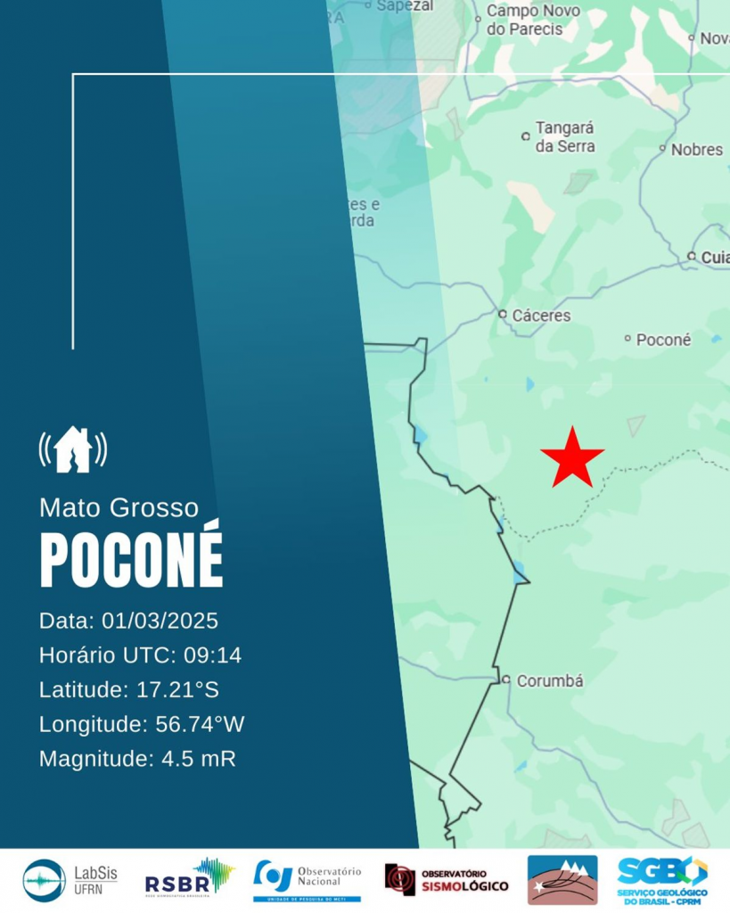 O município de Poconé, em Mato Grosso, registrou um terremoto de magnitude 4,5 na Escala Richter nesse sábado (1º/3). A cidade fica localizada a 100 km da capital do estado, Cuiabá. A escala vai até 10.