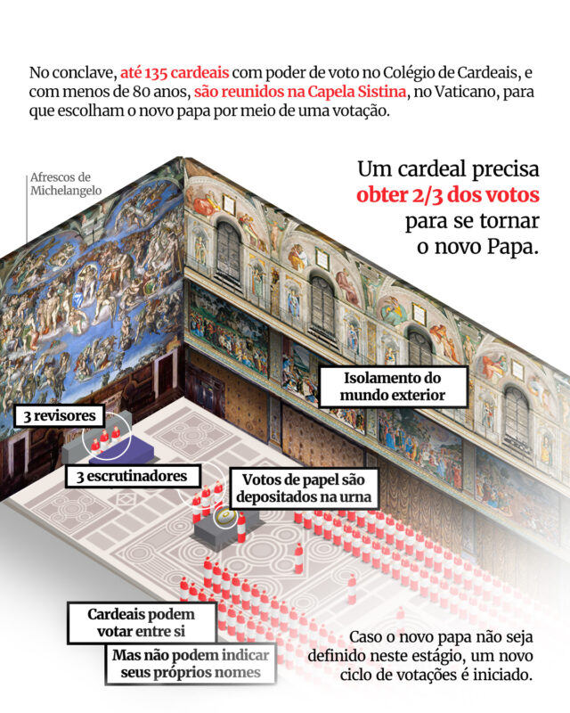 Após a morte de Francisco um novo pontífice precisa ser escolhido para ocupar o cargo. Com a Sé vacante, o Vaticano marcou para quarta-feira, 7 de maio, o conclave, que ocorre quando os cardeais se reúnem e elegem o novo papa. No entanto, a formulação da cerimônia passou por algumas mudanças nos últimos tempos.