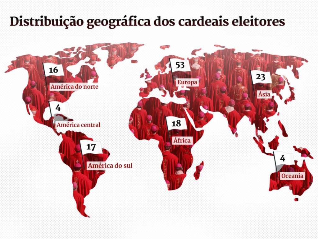A divisão geográfica dos cardeiais aptos a votarem permite que tenhamos uma ideia do peso de cada regão na escolha do novo líder da Igreja Católica.