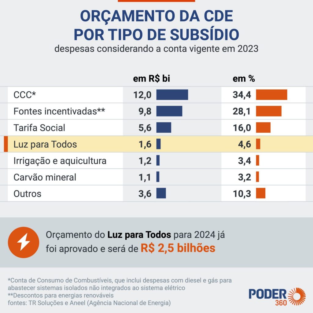 A estimativa considera o valor aprovado para o Luz para Todos para 2024. O programa de universalização do fornecimento de energia, relançado pelo presidente Luiz Inácio Lula da Silva (PT), vai custar R$ 2,5 bilhões para a CDE no próximo ano. Em 2023, a despesa aprovada para universalização foi de R$ 1,6 bilhão.