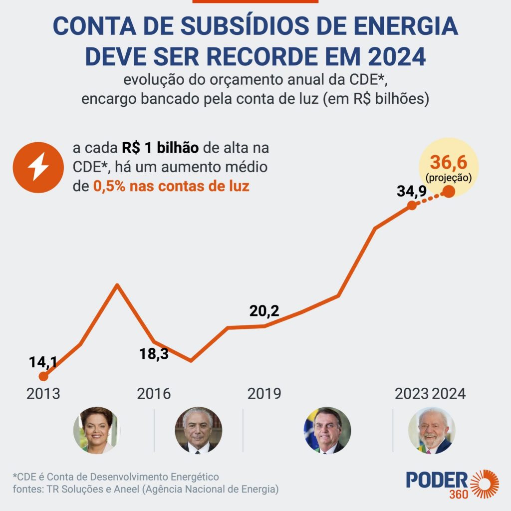 A CDE (Conta de Desenvolvimento Energético) deve ter um orçamento de R$ 36,6 bilhões em 2024, segundo projeção da consultoria do setor elétrico TR Soluções. Se confirmado o valor, o país baterá recorde no pagamento de subsídios na conta de luz. Em relação a 2023, a alta será de R$ 1,7 bilhão, ou 4,9%.