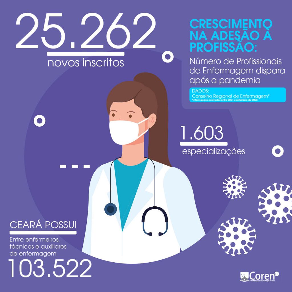 Desde a pandemia de 2020, a população percebeu o serviço notável que os profissionais de Enfermagem exercem dentro dos ambientes hospitalares. Cada vez mais pessoas querem exercer a profissão. De acordo com os dados do Conselho Regional de Enfermagem do Ceará (Coren-CE), o número de profissionais inscritos nos últimos três anos ultrapassa os 25 mil, sendo enfermeiros, técnicos e auxiliares de Enfermagem.