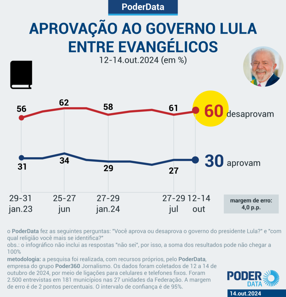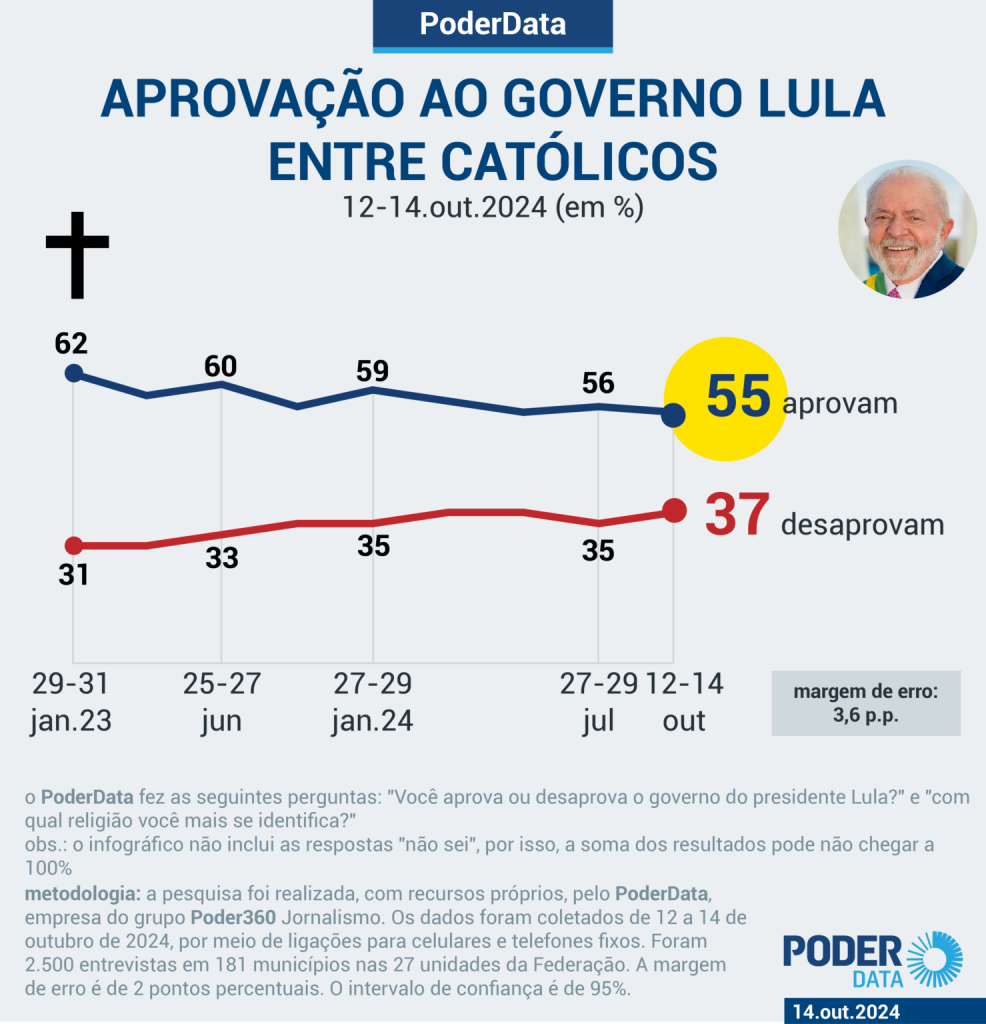 A pesquisa cujos dados são relatados neste texto foi realizada pelo PoderData, empresa do grupo Poder360 Jornalismo, com recursos próprios. Os dados foram coletados de 12 a 14 de outubro de 2024, por meio de ligações para celulares e telefones fixos. Foram 2.500 entrevistas em 181 municípios nas 27 unidades da Federação. A margem de erro é de 2 pontos percentuais. O intervalo de confiança é de 95%.