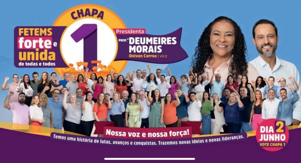 A candidata finaliza com um apelo aos filiados: “No dia 2 de junho peço para que nossas(os) filiadas(os) votem com consciência na Chapa 1 que tem história de lutas e representatividade. Por uma FETEMS de todas e todos, vote Chapa 1 com Deumeires Presidenta e Onivan Vice-Presidente”.