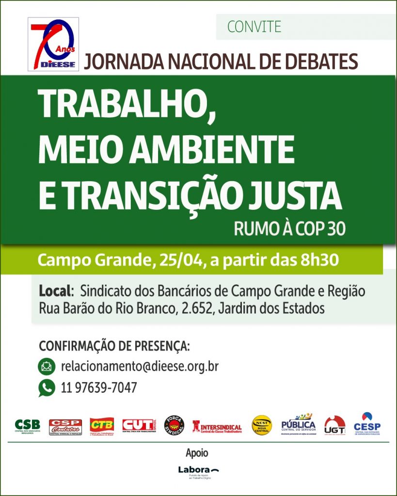 Na próxima sexta-feira, 25, a partir das 8h30, o Escritório Regional do Departamento Intersindical de Estatística e Estudos Socioeconômicos (DIEESE) em Mato Grosso do Sul, em conjunto com as Centrais Sindicais e apoio do Labora – Fundo de Apoio ao Trabalho Digno, realiza o debate “Trabalho, Meio Ambiente e Transição Justa – rumo à COP 30”. O evento integra a Jornada Nacional de Debates, promovida pelas entidades em 17 capitais brasileiras em 2025 para discutir a questão do trabalho e da transição justa.