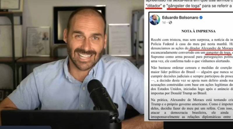 “O tempo todo a gente tem que expor o nível de várzea que é o Moraes com a caneta do STF. O ideal seria ele fora do STF. Trabalharei para isso também, tá, Moraes? Então, quando a gente fala que o visto foi só o começo, é porque o nosso objetivo será te tirar da Corte. Você não é digno de estar no topo do Poder Judiciário. E eu tô disposto a me sacrificar para levar essa ação adiante”, disse Eduardo.