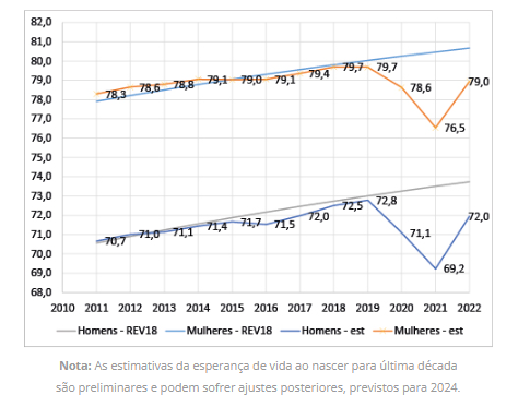 Já a esperança de vida aos 60 anos era de 21,9 anos para o total da população em 2022. A expectativa de vida nessa faixa etária para os homens era de 20,0 anos e para as mulheres, de 23,5 anos.