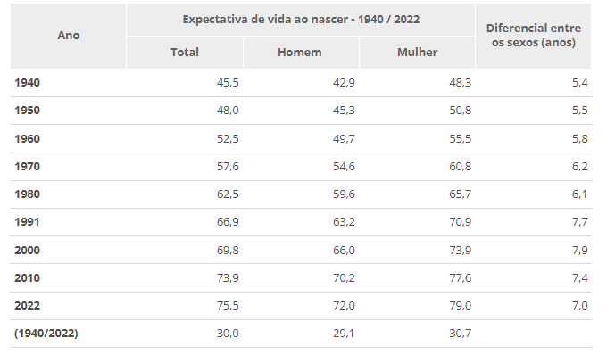 Na tabela a seguir, um panorama da expectativa de vida do país, desde 1940 até 2022. Observa-se que, no período, este indicador aumentou em 30,0 anos, sendo 29,1 anos para os homens e 30,7 anos para as mulheres.