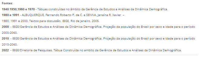 Os dados de óbitos utilizados nesta divulgação foram os registros de óbitos provenientes do Sistema de Informações sobre Mortalidade (SIM), disponibilizadas pelo Ministério da Saúde, corrigidos por sub-registro. Foram utilizados também os dados de população obtidos do Censo Demográfico 2022, resultados do Universo, por idade e sexo.