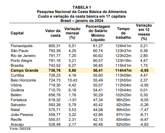 No primeiro mês de 2024, o custo da cesta básica aumentou em 16 das 17 capitais onde o DIEESE (Departamento Intersindical de Estatística e Estudos Socioeconômicos) realiza mensalmente a Pesquisa Nacional da Cesta Básica de Alimentos. A única redução ocorreu em Fortaleza (-1,91%). As elevações mais importantes foram registradas em Belo Horizonte (10,43%), Rio de Janeiro (7,20%), Brasília (6,27%) e Goiânia (6,18%).