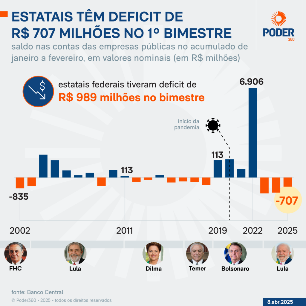 O déficit das estatais foi menor no 1º bimestre deste ano em relação ao mesmo período do ano passado, quando o saldo negativo foi de R$ 1,168 bilhão. O Poder360 mostrou, em janeiro, que as estatais fecharam 2024 com o maior déficit anual da história. Somou R$ 8,07 bilhões.