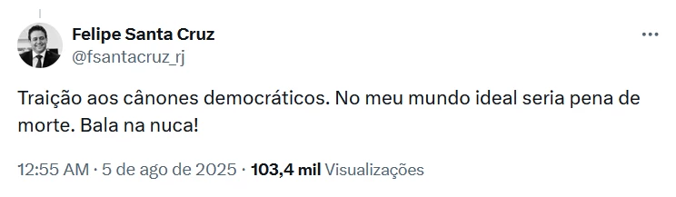 – Traição aos cânones democráticos. No meu mundo ideal seria pena de morte. Bala na nuca! – escreveu Santa Cruz, após um internauta questionar qual crime de Bolsonaro justificaria a prisão dele.