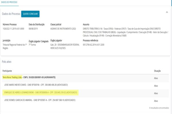 O advogado Enrique Lewandowski atua como representante legal da Terra Nova Trading desde 2018, em diversos processos de natureza cível e tributária, conforme pode ser verificado nos registros judiciais disponíveis.