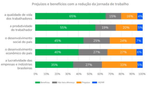 Para 65% dos participantes da pesquisa, a redução dos dias de trabalho traria maior qualidade de vida para a população. Outros 16% acham que traria prejuízo, 15% disseram que não faria diferença e 4% não souberam responder.
