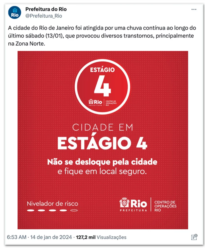 O nível é o 4º em uma escala de 5. Significa que uma ou mais ocorrências graves impactam a cidade. Também é estabelecido quando há incidência simultânea de diversos problemas de médio e alto impacto em diferentes regiões. O centro pediu para que a população carioca “evite deslocamentos e mantenha-se em local seguro”.