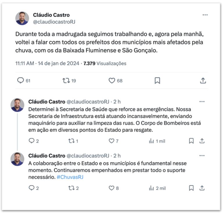 “Determinei à Secretaria de Saúde que reforce as emergências. Nossa Secretaria de Infraestrutura está atuando incansavelmente, enviando maquinário para auxiliar na limpeza das ruas. O Corpo de Bombeiros está em ação em diversos pontos do Estado para resgate”, escreveu Castro no X.