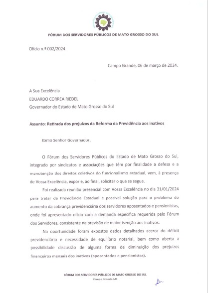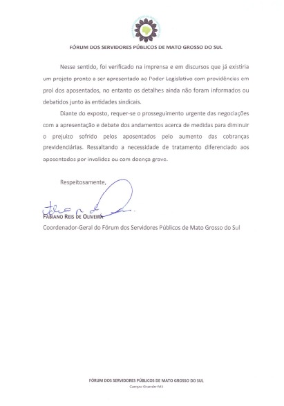 O coordenador geral do Fórum dos Servidores do Estado de Mato Grosso do Sul, Fabiano Reis, enviou um ofício ao governador Eduardo Riedel (PSDB), nesta quarta-feira, 06 de março, solicitando a continuidade das negociações envolvendo a previdência estadual.