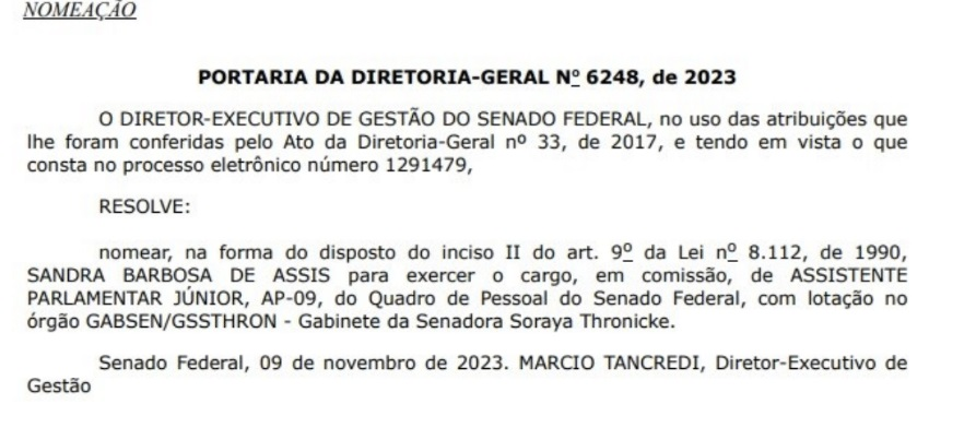 O empresário conta com duas pessoas próximas lotadas no gabinete de Soraya Thronicke no Senado. A irmã, Sandra Barbosa de Assis, foi nomeada no dia 9 de novembro do ano passado para atuar como assistente parlamentar sênior da senadora sul-mato-grossense. No mês passado, ela teve salário de R$ 14.274,75 e mais auxílio refeição de R$ 1.373,11.