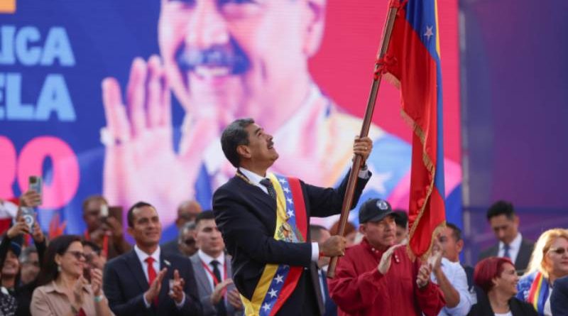O presidente venezuelano Nicolás Maduro agita uma bandeira em um ato durante sua posse/Foto: Ronald Peña R./EFE