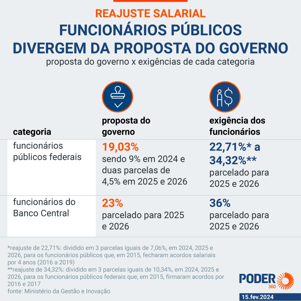 Em relação ao reajuste de salário dos funcionários do Banco Central, o governo federal propôs um aumento de até 23%, dividido em duas parcelas nos anos de 2025 e 2026. A categoria quer reajuste de 36% e uma reestruturação da carreira. A proposta inicial previa um reajuste de 13%, mas o governo aumentou o percentual depois de os representantes da categoria sinalizarem greve.