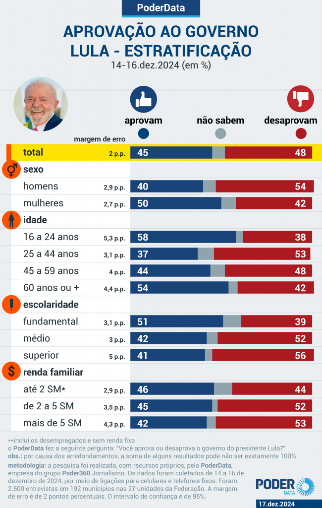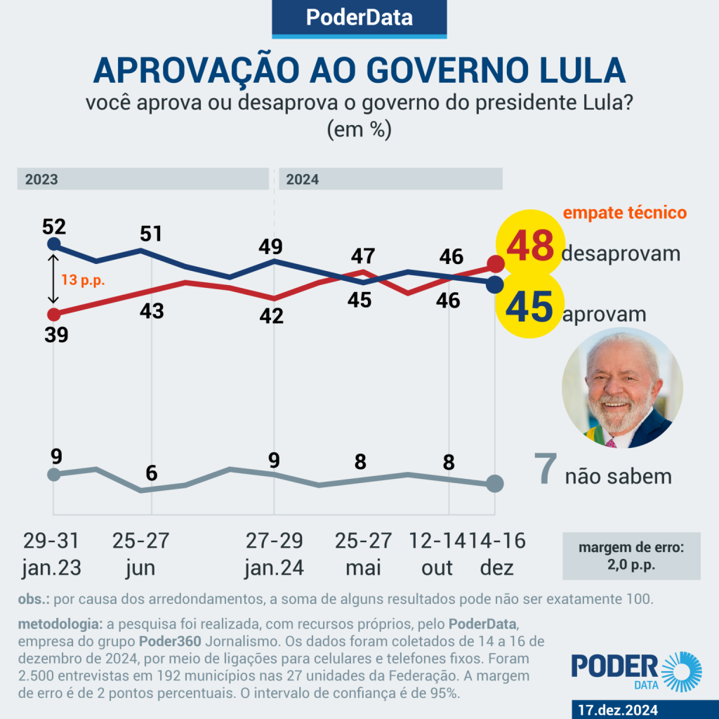 A pesquisa PoderData foi realizada de 14 a 16 de dezembro de 2024. Foram entrevistadas 2.500 pessoas com 16 anos de idade ou mais em 192 municípios nas 27 unidades da Federação. Foi aplicada uma ponderação paramétrica para compensar desproporcionalidades nas variáveis de sexo, idade, grau de instrução, região e renda. A margem de erro é de 2 pontos percentuais, para mais ou para menos.