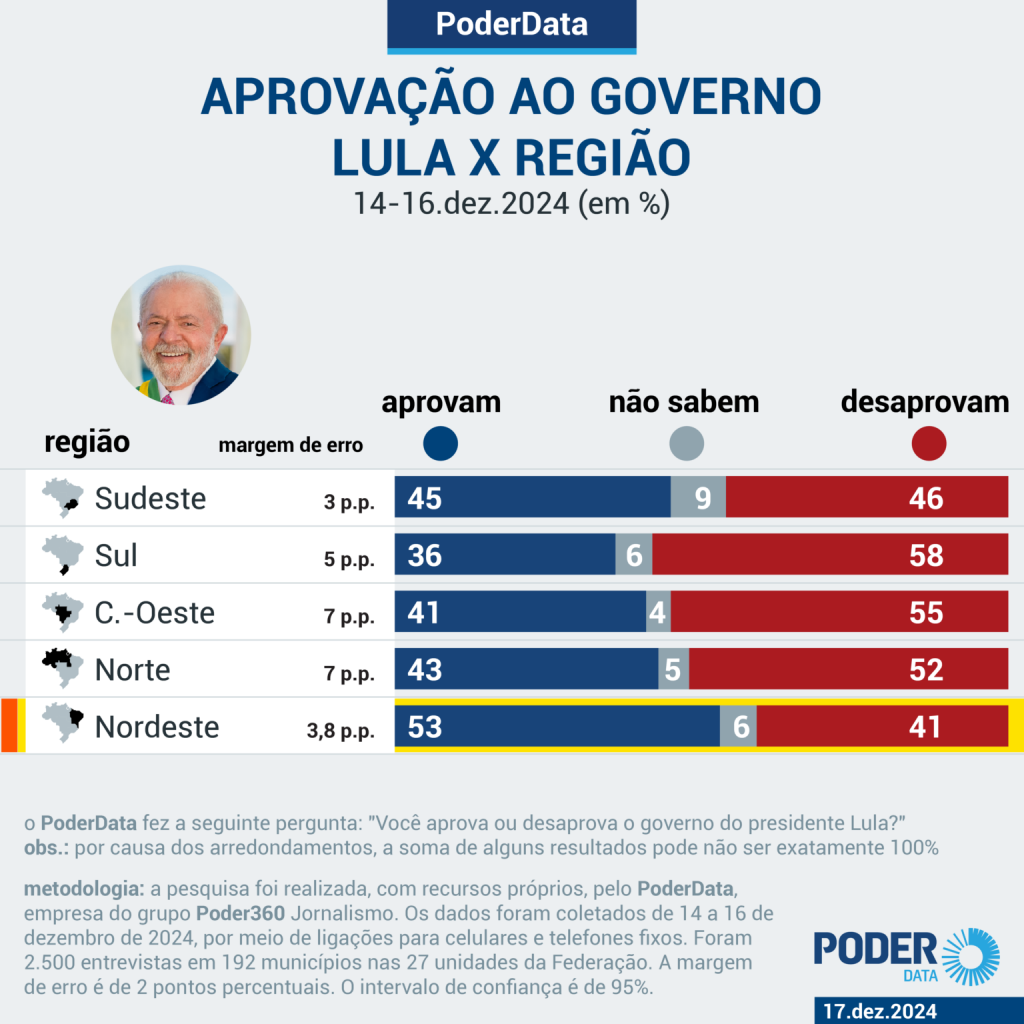 Levantamento mostra ainda que o Nordeste é a única região em que a maioria (53%) dos moradores diz aprovar a gestão de Lula/poder360.com.br/Jonathan Karter