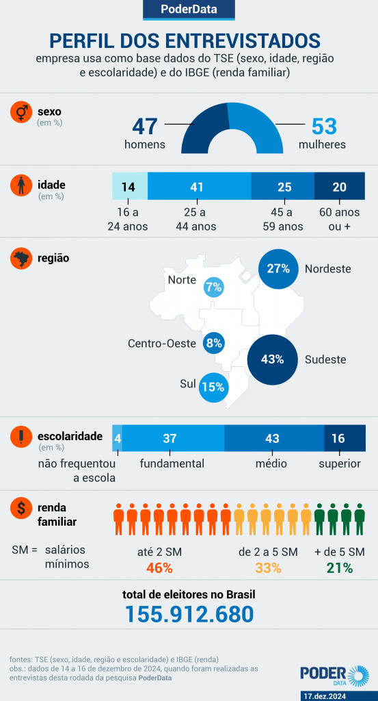 A pesquisa cujos dados são relatados neste post foi realizada pelo PoderData, empresa do grupo Poder360 Jornalismo, com recursos próprios. Os dados foram coletados de 14 a 16 de dezembro de 2024, por meio de ligações para celulares e telefones fixos. Foram 2.500 entrevistas em 192 municípios nas 27 unidades da Federação. A margem de erro é de 2 pontos percentuais. O intervalo de confiança é de 95%.