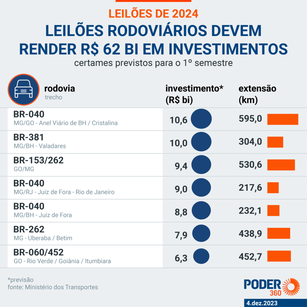 Para o 1º semestre, serão 7 leilões, com previsão de movimentar R$ 62 bilhões. O governo colocará em disputa um total de 2.770,9 km.