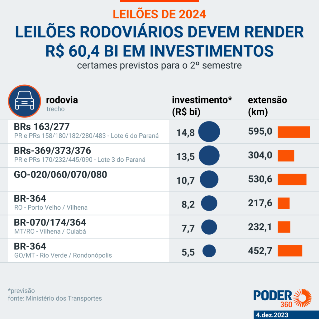 Para o 2º semestre, as concessões vão render R$ 60,4 bilhões em investimentos privados para as rodovias. Serão 6 trechos rodoviários que compreendem um total de 3.917,8 km.