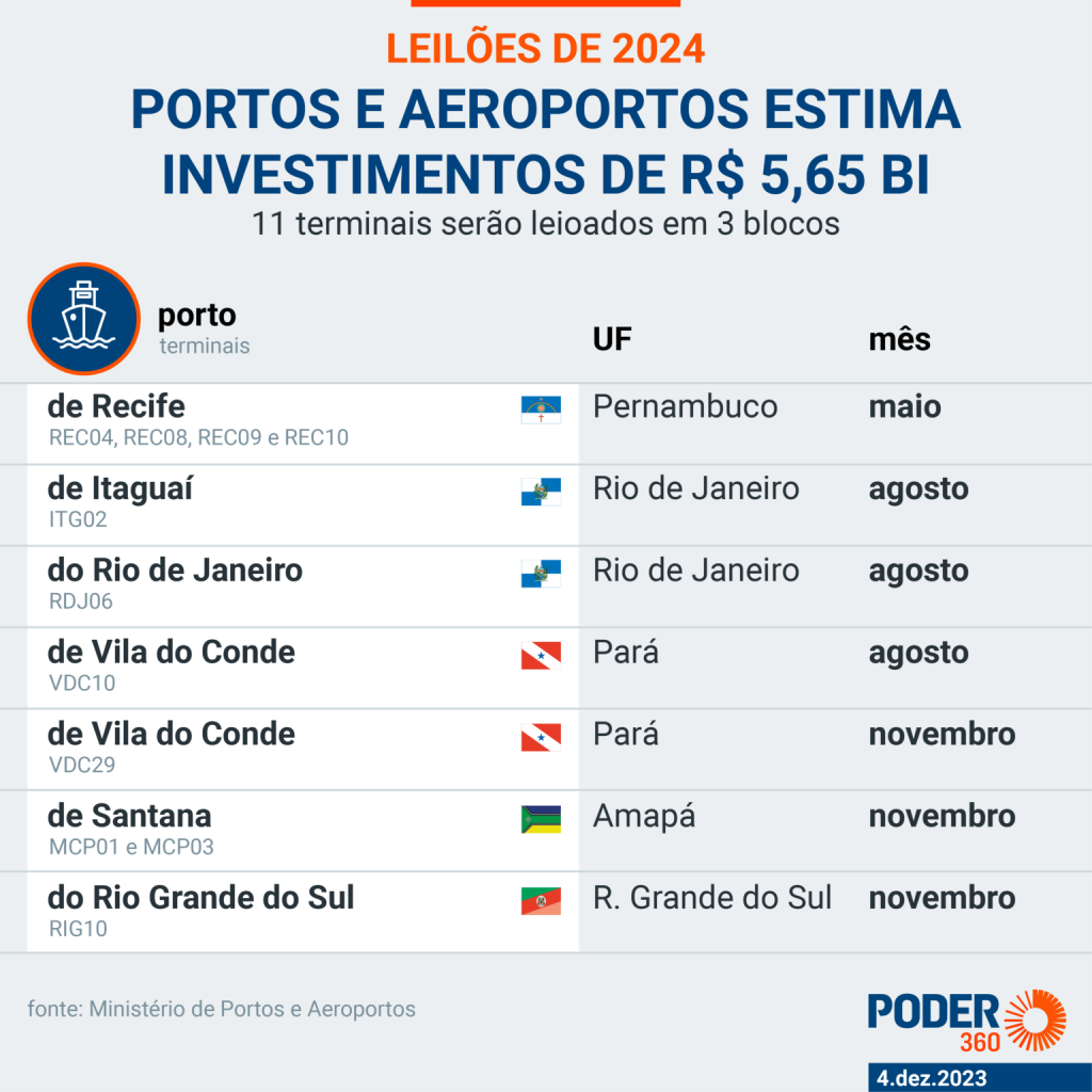 O Ministério de Portos e Aeroportos ficou responsável pela concessão de 11 terminais espalhados por 6 portos. As estruturas vão ser leiloadas em 3 blocos. Os leilões estão previstos para março, agosto e novembro.