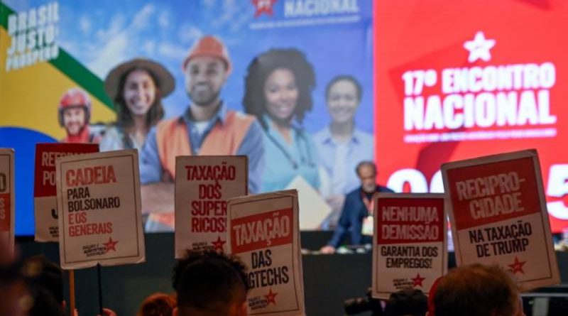 Militante petista levanta placa pedindo “reciprocidade na taxação de Trump” durante o 17º Encontro Nacional do partido, em Brasília/Foto: Divulgação/PT