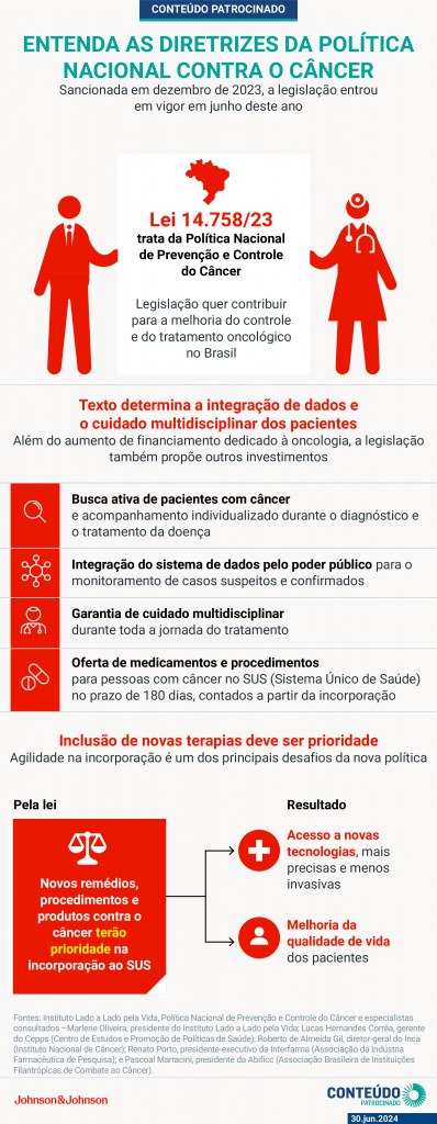 Sancionada em dezembro de 2023, a nova política entrou em vigor em junho deste ano com foco em garantir a melhoria do controle e do tratamento de câncer na saúde pública do país. Nesse sentido, além do maior financiamento, a inclusão de novas tecnologias, procedimentos e medicamentos oncológicos é essencial diante de um cenário de alta de casos da doença, explicam os especialistas ouvidos pelo Poder360.