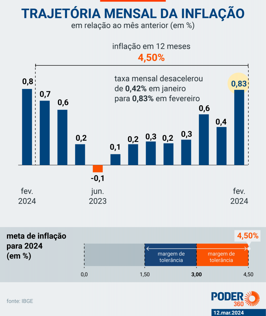 Medida pelo IPCA (Índice Nacional de Preços ao Consumidor Amplo), a inflação do Brasil acelerou de 0,42% em janeiro para 0,83% em fevereiro. O IBGE (Instituto Brasileiro de Geografia e Estatística) divulgou o resultado nesta 3ª feira (12.mar.2024). Eis a íntegra da apresentação (PDF – 691 kB). O resultado de fevereiro ficou acima da mediana das projeções dos analistas do mercado financeiro, que apostavam em uma taxa de 0,78% no mês.