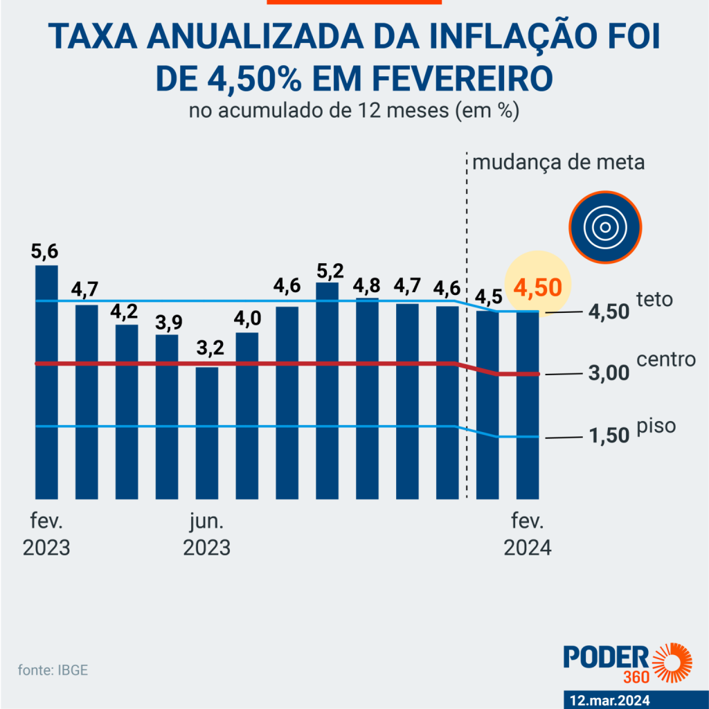 A inflação acumula alta de 1,25% no 1º bimestre. Em 12 meses, a taxa acumulada caiu de 4,51% para 4,50%. A meta de inflação do Brasil em 2024 é de 3%, mas tem intervalo de tolerância de 1,5 ponto percentual para cima e para baixo. Portanto, ainda será considerado dentro da meta caso a inflação fique entre 1,5% e 4,5%.