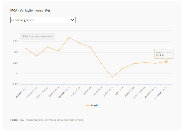 A inflação do mês de novembro foi de 0,28%, uma variação 0,04 ponto percentual (p.p.) acima da taxa de outubro (0,24%). Esse resultado foi influenciado pela alta dos preços do grupo de alimentos e bebidas do Índice Nacional de Preços ao Consumidor Amplo (IPCA) divulgado hoje (12) pelo IBGE. No ano, a inflação oficial acumula alta de 4,04% e, nos últimos 12 meses, de 4,68%, abaixo dos 4,82% observados nos 12 meses imediatamente anteriores. Em novembro de 2022, a variação havia sido de 0,41%.