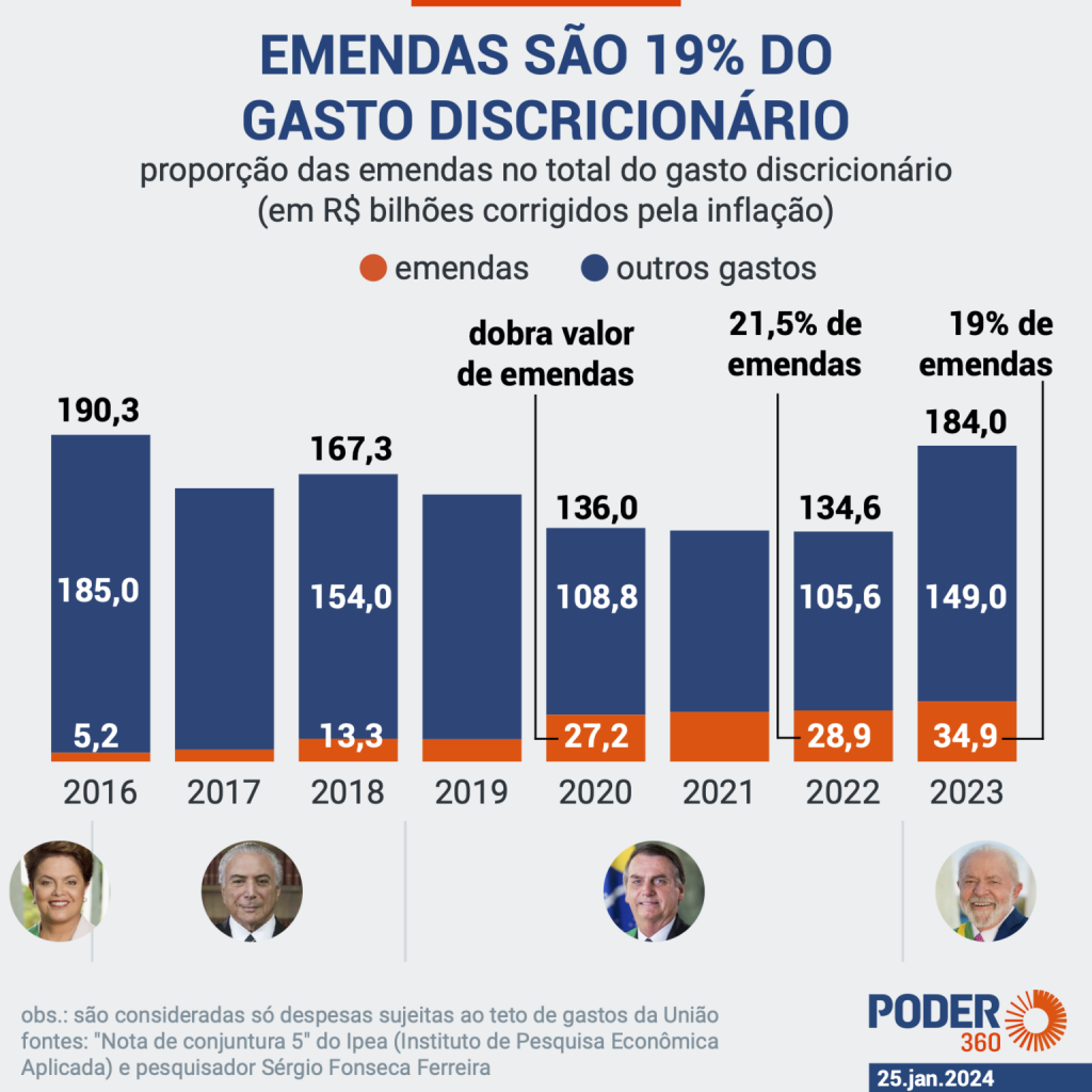 Embora as emendas tenham aumentado, a parcela que ocupam desse dinheiro diminuiu. Em 2022, os congressistas tiveram 21,5% do gasto discricionário. Em 2023, foram 19%.