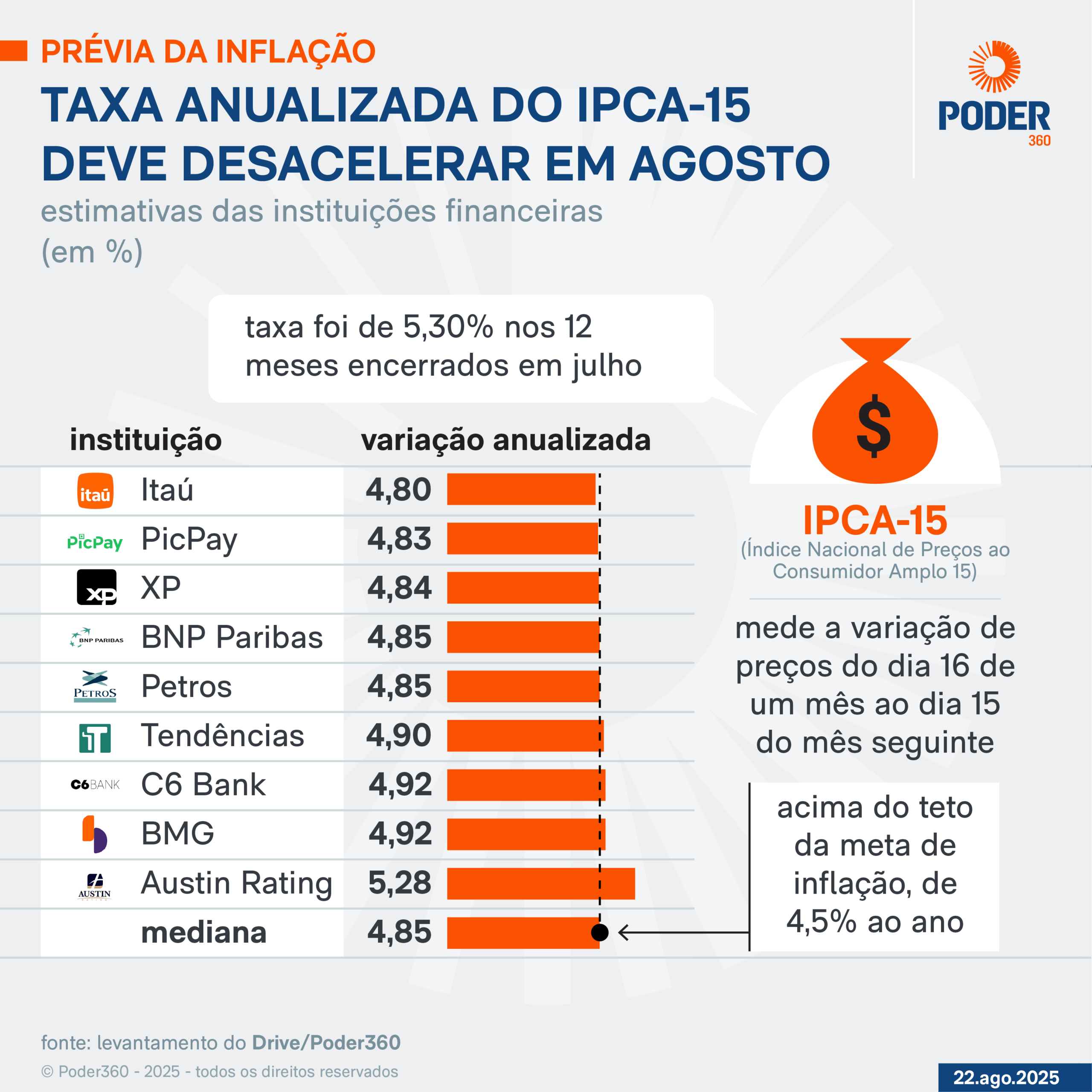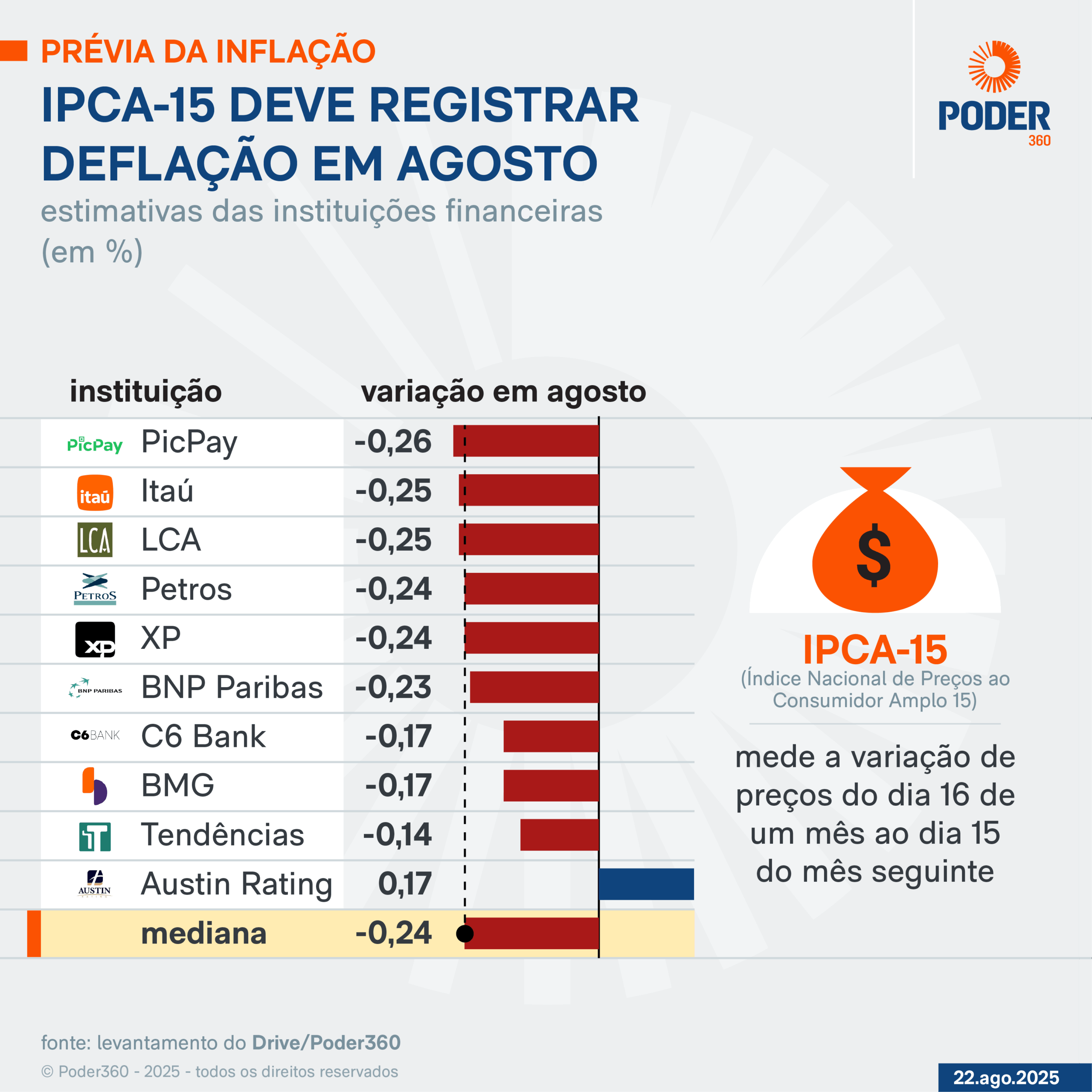 O Poder360 consultou 10 instituições financeiras. Nove delas apontaram que haverá recuo nos preços de bens e serviços no mês pela 1ª vez em 3 anos. Leia o infográfico abaixo: