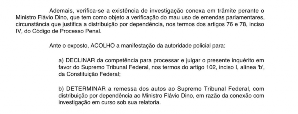 A PF justificou o pedido de redistribuição por conexão com investigações já conduzidas por Dino que tratam do mau uso de emendas parlamentares. Em decisão anterior, Dino suspendeu o pagamento de R$ 4,2 bilhões em emendas e destacou o episódio de apreensão de dinheiro em um avião, em Brasília, no decorrer da operação da PF.