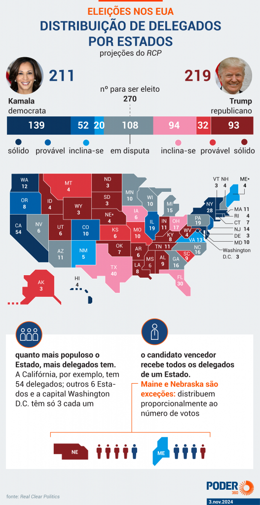Para ser eleito, é preciso ao menos 270 delegados dos 538 em disputa. Projeções do site Real Clear Politics mostram Kamala com 211 delegados e Trump, com 219. Considerando a vantagem numérica pela média das pesquisas nos Estados em disputa, o republicano venceria em 5 e seria eleito com 287 delegados. Já a democrata levaria em 2 e somaria 236.
